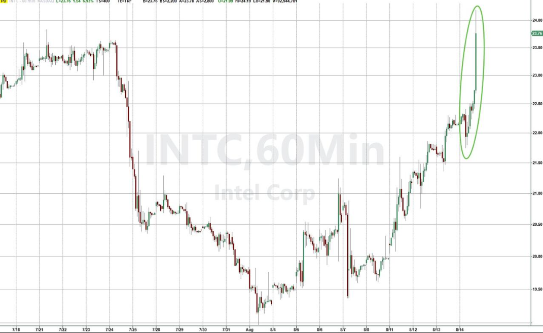 受此音信影响,英特尔股价周四盘中一度高涨8.9%,收盘报23.86好意思元,涨幅7.4%,公司市值升至约1044亿好意思元。惯例往来时段收场后,盘后往来中该股价赓续攀升逾4%。