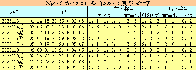 体彩大乐透第2025121期奖号为02 03 08 13 21 + 07 12,前区号码五区比为2:2:1:0:0,奇偶比为3:2,012路比为2:1:2,后区号码奇偶比为1:1,大小比为2:0。