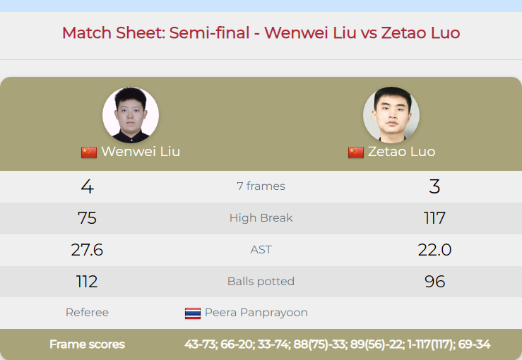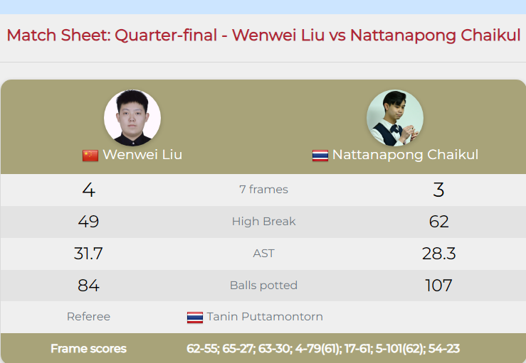 1/4决赛,刘文炜的敌手是泰国选手纳坦农-查伊库尔。这场比赛,刘文炜又以4-3奏凯晋级。比赛第一局,两东说念主就张开拉锯战,胶著的比赛中,刘文炜通过几次上手,62-55先拔头筹,1-0向上。