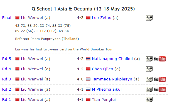 赵心童夺得2025年斯诺克世锦赛冠军后,中国斯诺克军团又出战2025年斯诺克亚太Q School 1,21岁的刘文炜的证实极为出色。