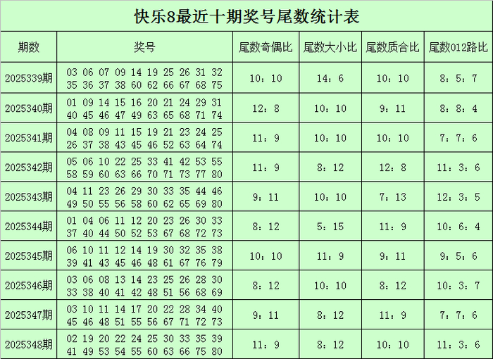 福彩欢乐8第2025348期开奖回来:02 19 20 22 24 25 30 33 35 39 41 49 53 54 55 60 63 66 75 80,其中奖号余数奇偶比为11:9,余数012路比为11:3:6,余数大小比为8:12,余数质合比为10:10。